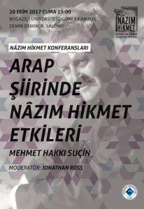 Mehmet Hakkı Suçin’in konuşacağı Nâzım Hikmet’in Arap Şiiri üzerindeki etkisi konulu konferans, 20 Ekim Cuma 15:00’te, Boğaziçi Üniversitesi Demir Demirgil Salonu’nda yapılacak.