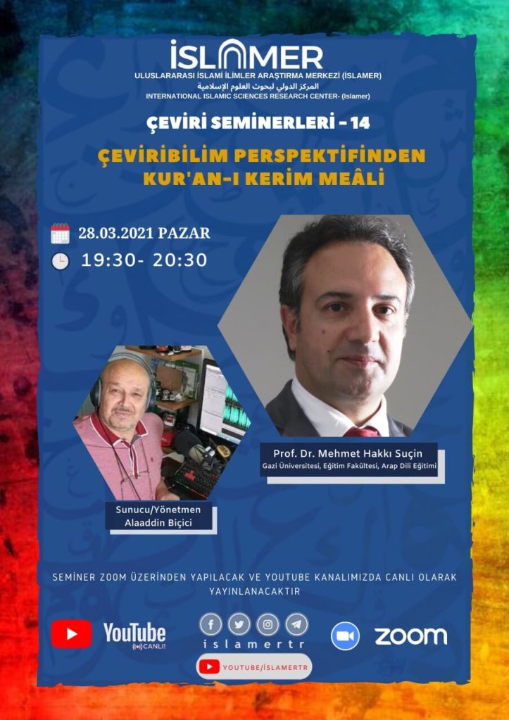 Uluslararası İslami İlimler Araştırma Merkezince düzenlenen seminerler çerçevesinde Mehmet Hakkı Suçin’in “Çeviribilim Perspektifinden Kur’an-ı Kerim Meâli” başlıklı semineri bugün (28.03.2021) Saat 19.30’da.